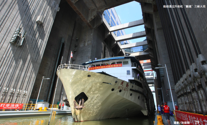 驅動機構啟動,齒輪沿齒條爬行,船廂以每秒0.2米的速度勻速上升,與此同時,驅動機構驅動安全機構、對接鎖定機構的螺桿沿螺母柱空轉,同步運行;當船廂運行至上游航道水位時,船廂停車,船廂對接鎖定機構動作,上、下鎖定螺桿與螺母柱接觸,上游間隙密封機構伸出與上閘首工作門對接,間隙充水至與上游水位齊平,閘門開啟,船廂水域與上游引航道水域連通,船只駛離船廂。單程通過時間約為37分鐘。