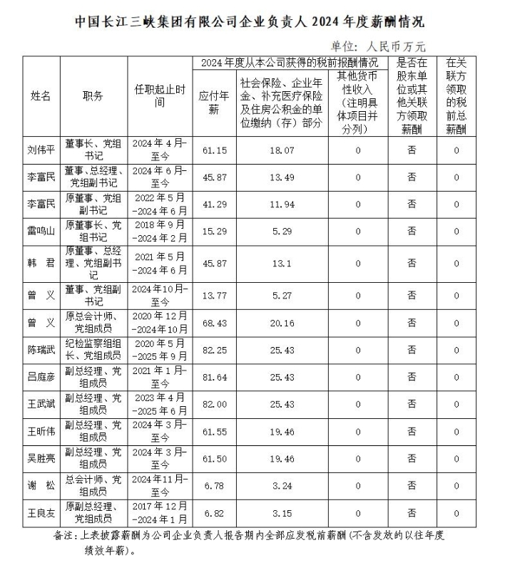 中國長江三峽集團有限公司企業負責人2024年度薪酬情況